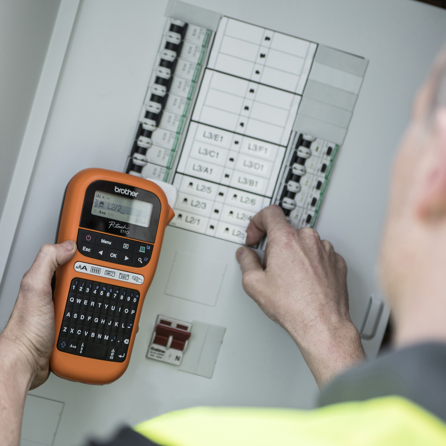 Ideal for use on residential projects, the PT-E110VP handheld labeller is the essential labelling solution for electricians, cable installers and craftsmen. It offers a graphic LCD screen and a QWERTY keyboard for easier and faster entry as well as several hot keys for shortcuts. See full product description