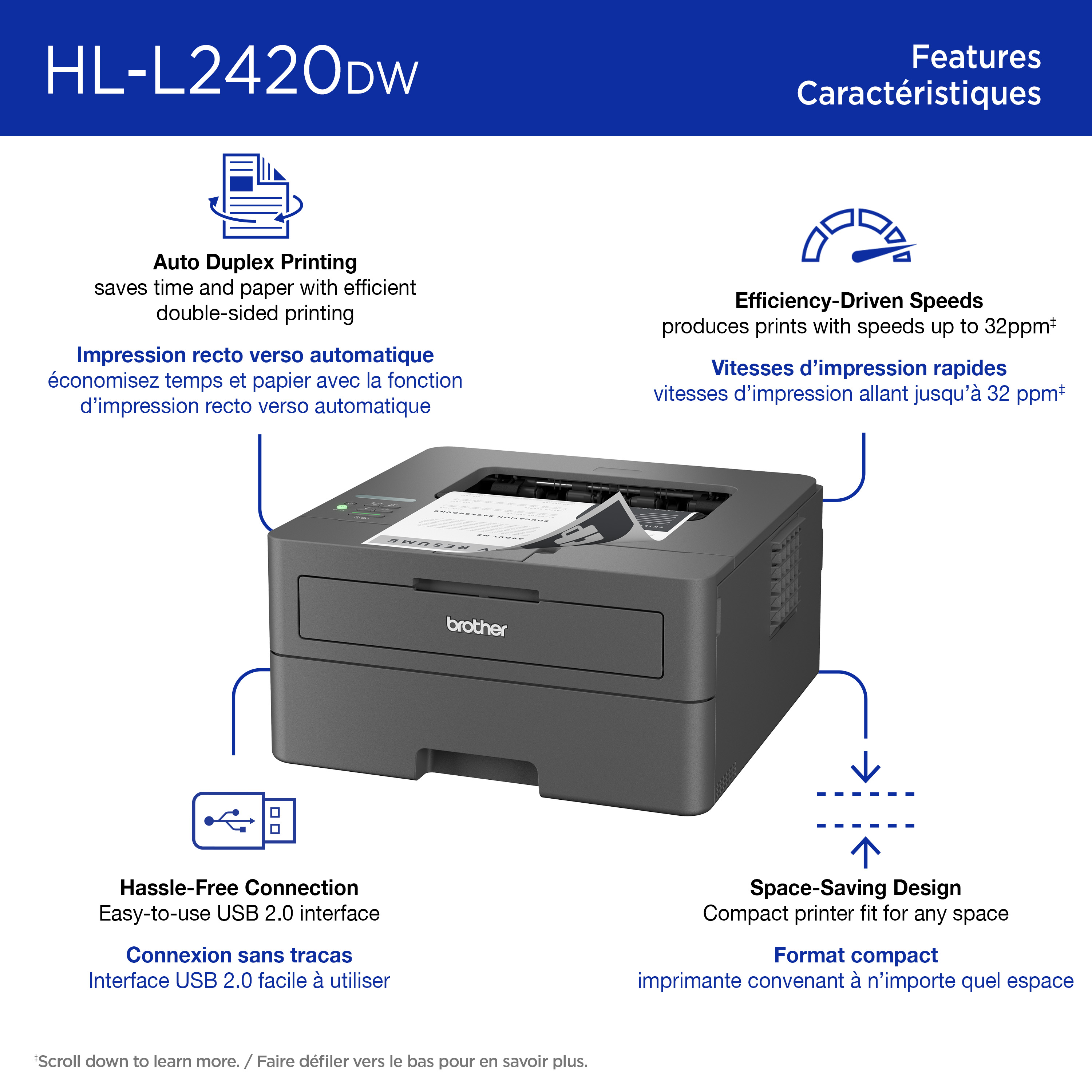 Efficace et abordable, l’imprimante HL-L2420DW laser monochrome compacte sans fil est le choix de confiance pour des impressions en noir et blanc de haute qualité. Grâce aux vitesses d’impression allant jusqu’à 30 pages par minute‡ (ppm), cette imprimante laser sans fil produit rapidement des documents nets et faciles à lire. Le bac à papier de 250 feuilles‡ réduit la fréquence des remplissages, tandis que l’impression recto verso automatique vous fera gagner du temps et contribuera à réduire le gaspillage de papier. Compact et durable, cette imprimante est idéale pour la maison, les bureaux à domicile et les petits bureaux. Elle offre des options de connectivités flexibles à partir de ses interfaces sans fil bibande et USB 2.0. L’application Brother Mobile Connect‡ vous permet d’imprimer où que vous soyez et les fonctions de sécurité avancées aident à protéger les données pendant l’impression.