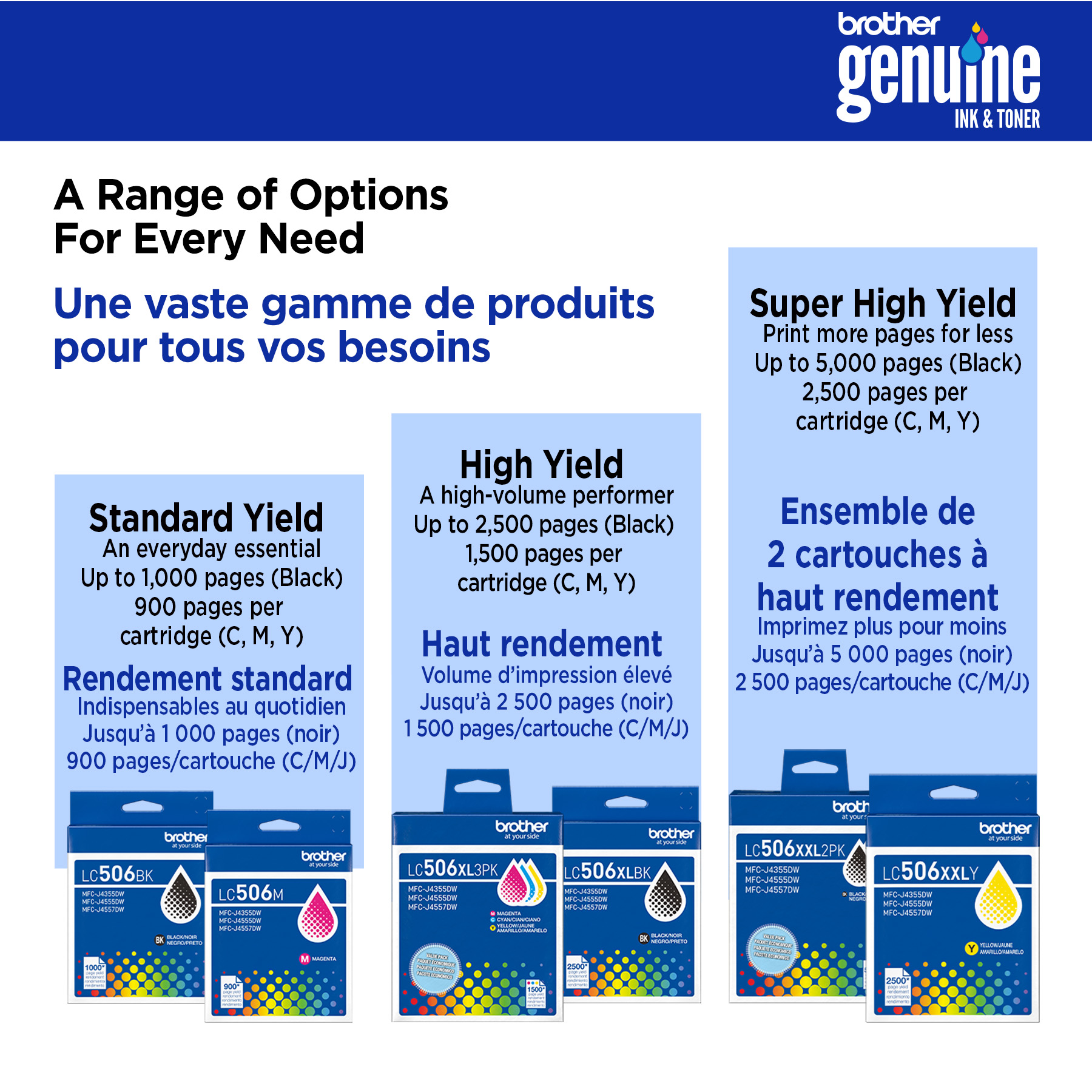 Que ce soit pour imprimer vos présentations ou vos billets d’avion, vous pouvez compter sur les cartouches d’encre authentiques de Brother. La cartouche d’encre noire à haut rendement LC506XLBKS produit des impressions nettes, jusqu’à 2 500 pages.(1) C’est la seule marque recommandée pour des résultats fiables et constants avec les imprimantes INKvestment MFC-J4355DW et MFC-J4555DW de Brother.