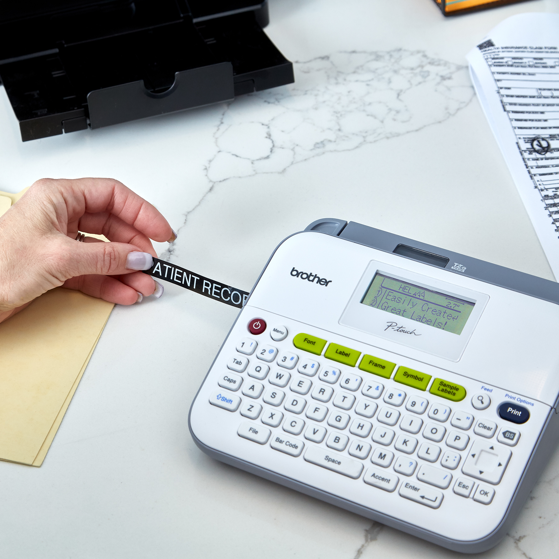 La PT-D400AD est une étiqueteuse facile à utiliser qui vous permet de créer des étiquettes personnalisées et d'allure professionnelle rapidement. Avec 14 polices de caractères, dix styles de polices, plus de 600 symboles et des codes à barres, cette étiqueteuse polyvalente peut répondre à pratiquement tous vos besoins d'étiquetage à la maison et au bureau. Il vous suffit de taper, de formater à l'aide des monotouches puis d'imprimer. Vous pouvez même enregistrer jusqu'à 50 étiquettes dans la grande mémoire, une fonctionnalité qui vous fera gagner du temps précieux. Avec son adaptateur secteur fourni, vous pouvez être sûr que votre étiqueteuse sera prête lorsque vous aurez besoin d'elle. La PT-D400AD fonctionne avec quatre largeurs de ruban TZe différentes et le design pratique de chargement du ruban par le haut vous permet de remplacer facilement les tailles et couleurs de cassette de ruban. Les rubans TZe standards sont durables et laminés afin de résister à l'eau, à la chaleur et à la décoloration.